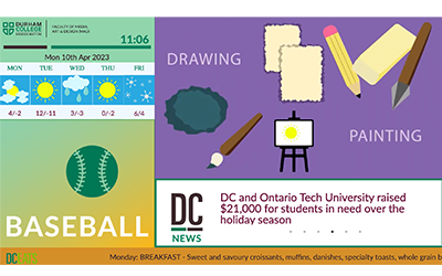 The project requirements was to create a news screen for durham college's department of media, art and design and have a functioning back end page linked to a database. The news screen was divided into 6 sections that required skills using photoshop, illustrator, after effects and using a database and php to output infomation.